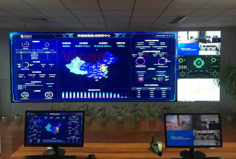 维康国际为明德集团提供的这套指挥中心大屏采用55寸液晶拼接屏,双边拼缝为3.5mm,主要用来做大数据及监控指挥使用。