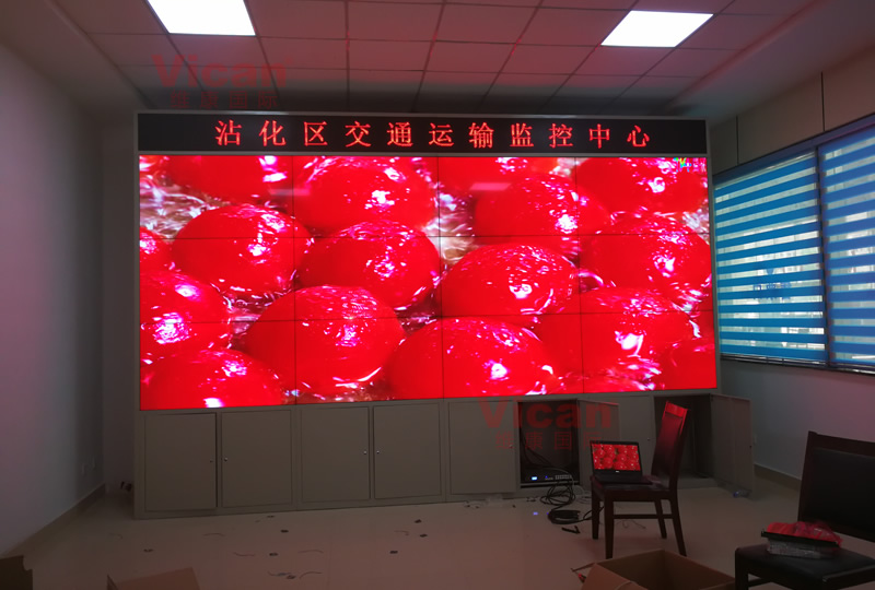 滨州市沾化区监控中心这套大屏采用3行4列、55寸拼接屏,超窄边设计、三星原装面板、拼缝仅有1.7mm,大屏幕显示清晰,主要用来视频监控系统显示。