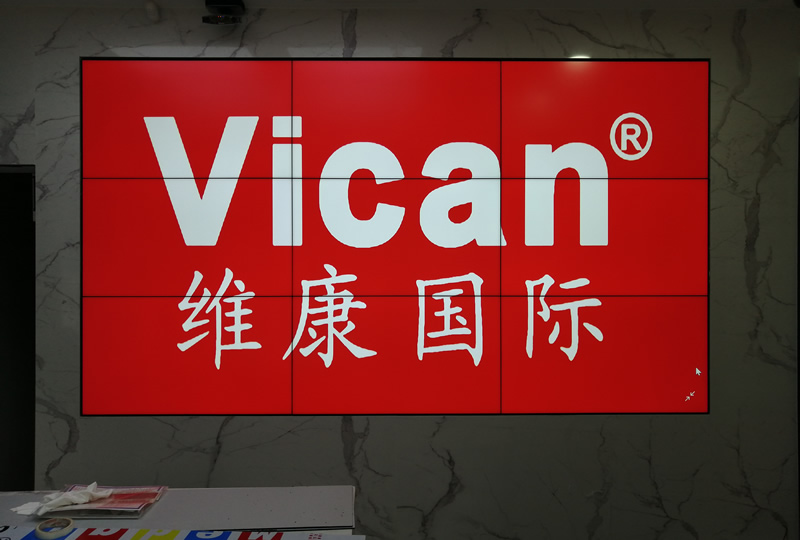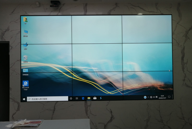 这套大屏采用3x3拼缝、46寸1.7mm液晶拼接屏,采用前维护内嵌式安装,大屏幕与墙面连成一体,更显美观、大气,主要用来会议信息显示。