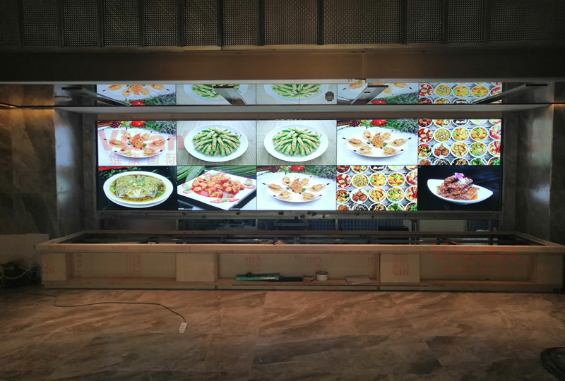 惠州海鲜酒店采用这套显示大屏,采用2x5拼接、55寸液晶拼接屏,3.5mm拼缝,主要用来显示美食特色与信息公告。