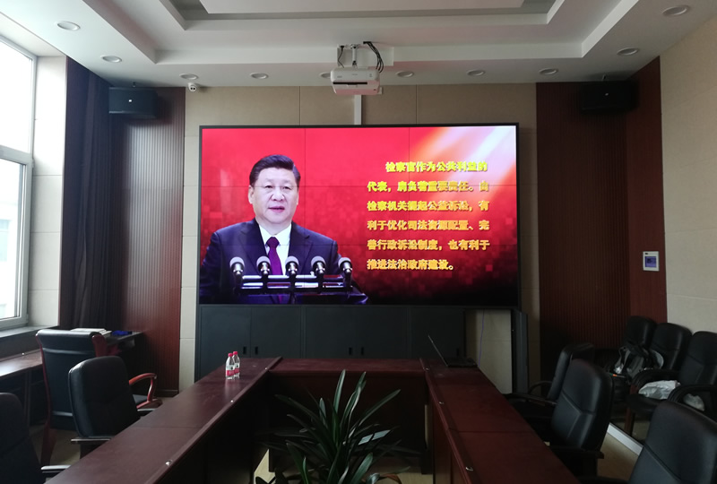 该案例中,维康国际为辽宁沈阳某检察院提供一套会议大屏,采用3行3列,机柜式安装安装的55寸液晶拼接屏,超窄边设计,双边物理拼缝仅有0.88mm,有着很好的大屏画面一体化显示效果。