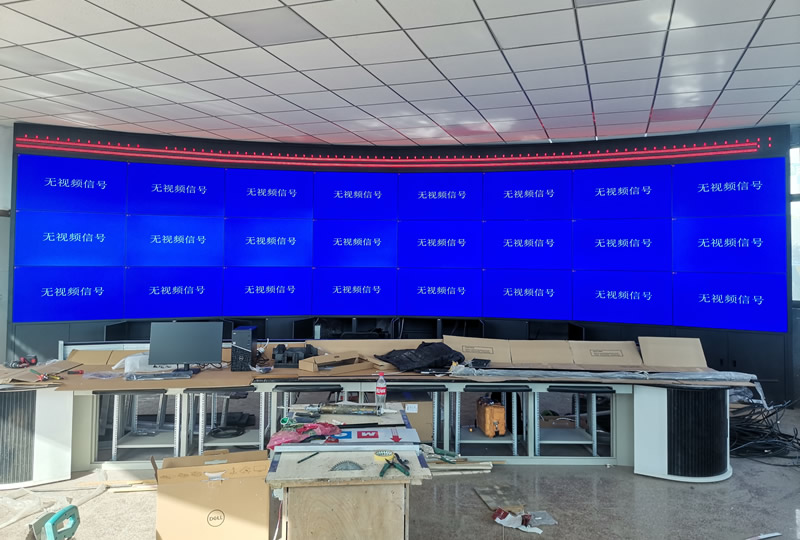 本案例中,维康国际为中腾环保提供一套指挥中心大屏,主要由3X8拼接、55寸3.5mm液晶拼接屏组成,大屏幕显示清晰亮丽,双边拼缝较小,采用机柜式弧形安装,更显高档大气,如上图所示,主要 用来显示监控画面及指挥调度。