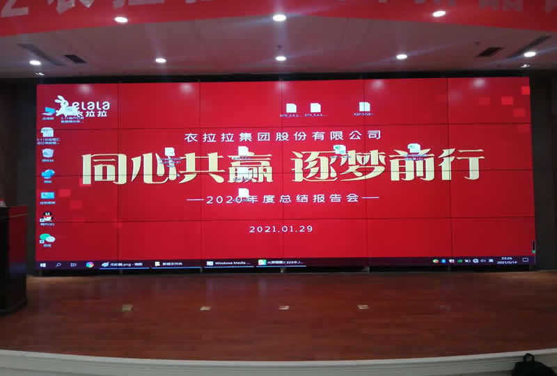 本案例中,维康国际为山东衣拉拉集团提供一套会议厅大厅,由4x6拼接、55寸液晶拼接屏组成,双边拼缝为3.5mm,大屏幕清晰、超大尺寸,如上图所示。
