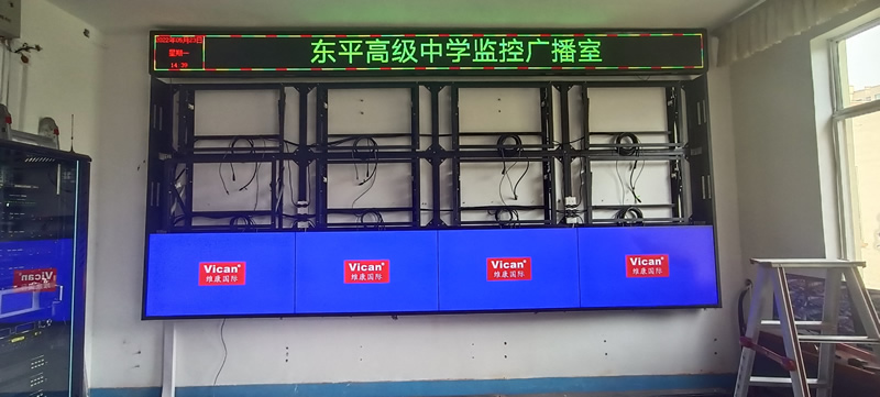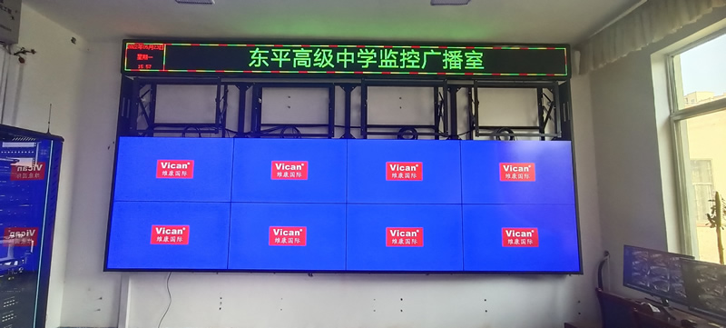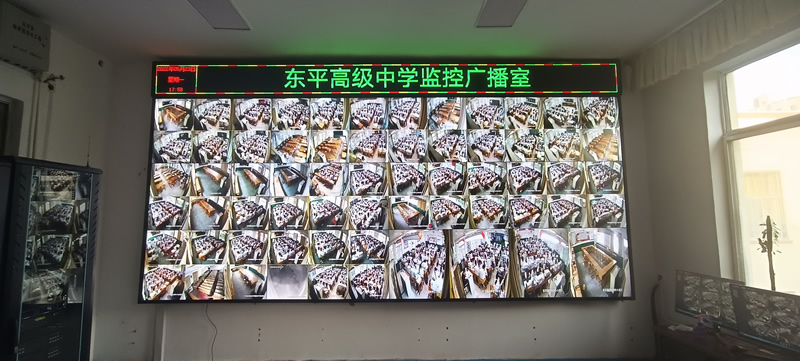 本案例中,维康国际为东平市高级中学的监控广播室提供一套显示大屏,采用3行4列、55寸液晶拼接屏,主要用来 显示监控画面,如上图所示。