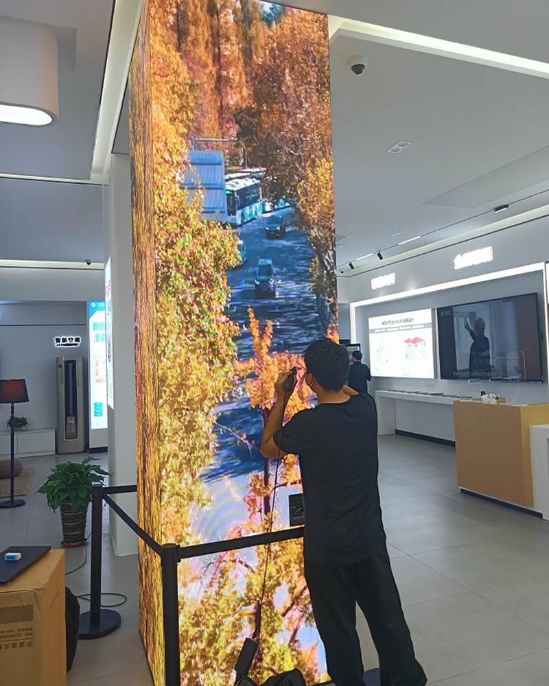 本案例中,是维康国际深圳市某营业厅提供的一套柱子LED显示屏,画面显示清晰亮丽,有着很好的视觉体验效果。