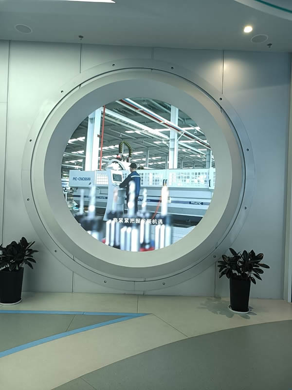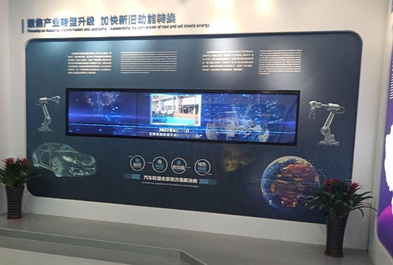 本案例中,维康国际为山东魏桥创业集团的展厅提供了多套多形状的LED显示屏,如上图所示,由梯形、圆形、长方形拼接组成,大屏幕显示清晰,视觉体验效果好。