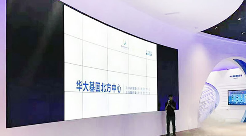 华大基因的展厅采用4x7拼接,55寸3.5mm液晶拼接大屏,用来展现信息及产品发布,有着很好的超大尺寸画面的视觉体验。