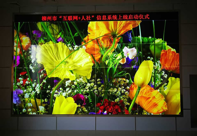 维康国际为柳州人社局提供的这套显示大屏,是4x4拼接、55寸电子无缝拼接屏。