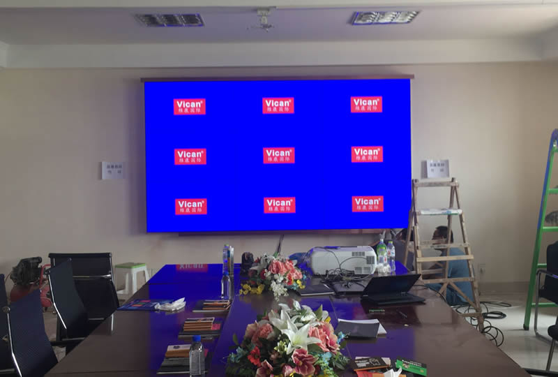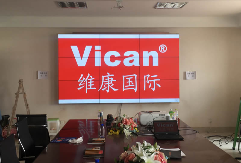本案例中,是维康国际为珠海某国企提供的一套会议室大屏,3x3/55寸液晶拼接屏,超小拼缝,采用壁画是安装,大屏幕显示清晰亮丽,一体化显示效果很好。