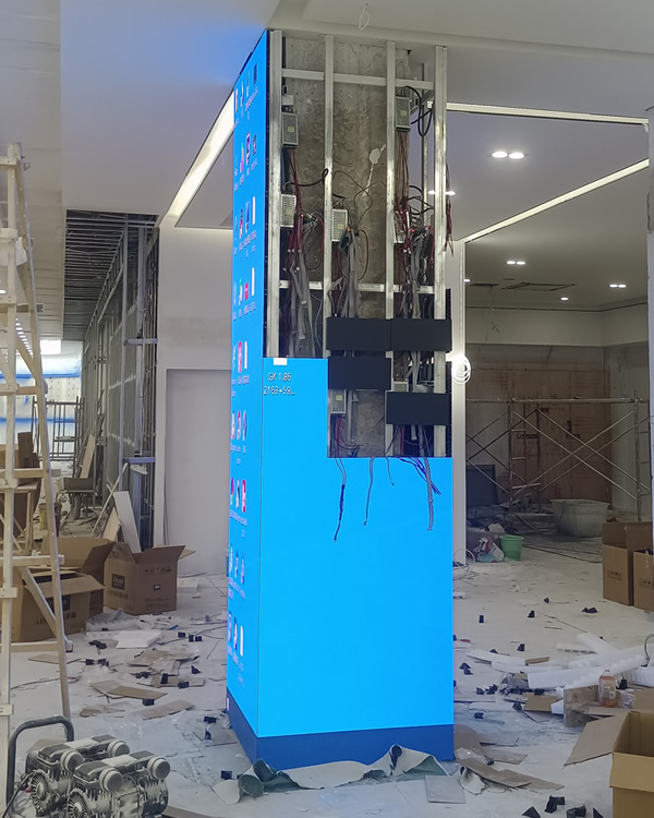 首先,根据安装环境(安装场地)、尺寸要求、观看距离等因素,进行详尽的设计规划。确定好圆柱型LED显示屏的弧度、直径、高度、分辨率等关键参数,定制圆柱形安装支架,并设计好电路布局、散热方案及结构支撑。
