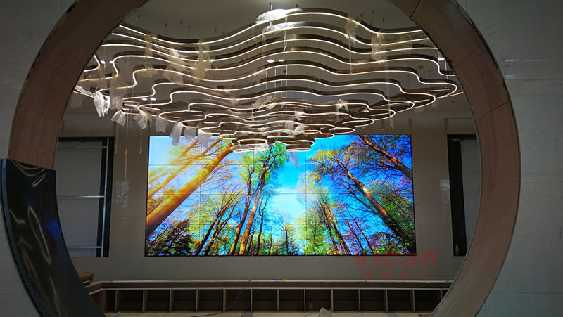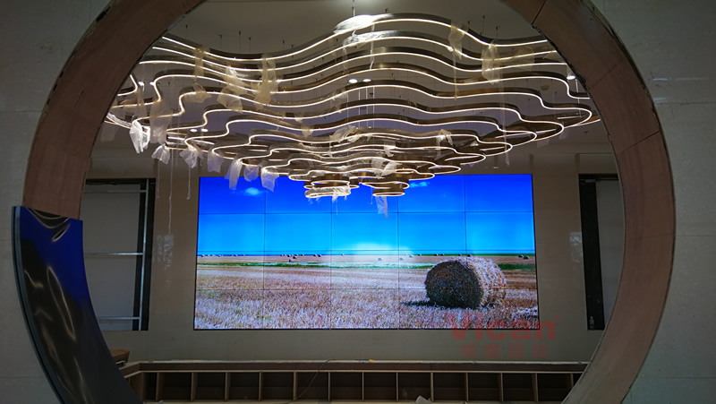 我公司为云南昆明某售楼中心提供的这套显示大屏,采用4行5列、55寸拼接屏,双边拼缝仅有3.5mm,大屏幕画面显示清晰、亮丽,有着很好的一体化显示效果,如上图所示。