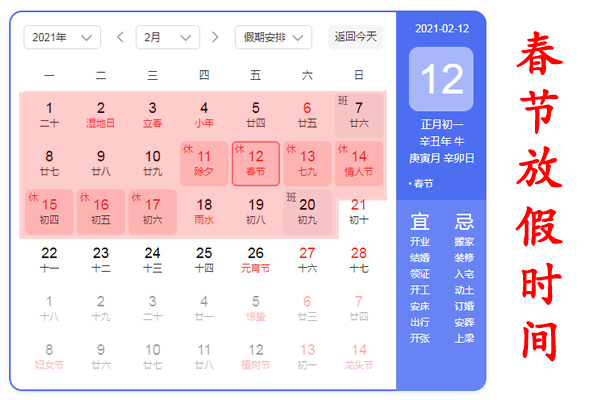 根据国家春节放假的规定,结合公司实际经营的状况,经董事会决定,对2021年春节的放假时间如下: