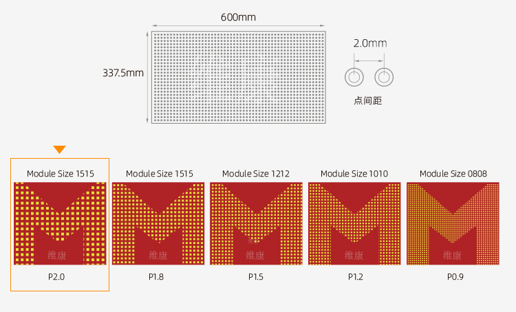 点间距只有2.0mm,采用SMD封装而成,主要应用于室内全彩显示大屏场合。