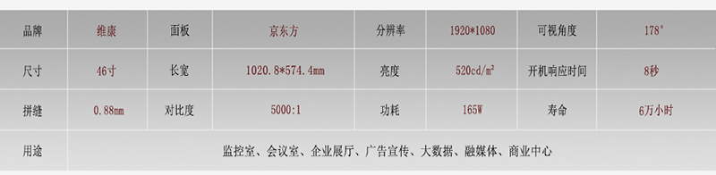 46寸拼接屏0.88mm拼缝的产品采用国产京东方面板组成,是目前除55寸以外另外一款可以做到0.88mm拼缝的产品,目前也只有京东方一款面板可选。