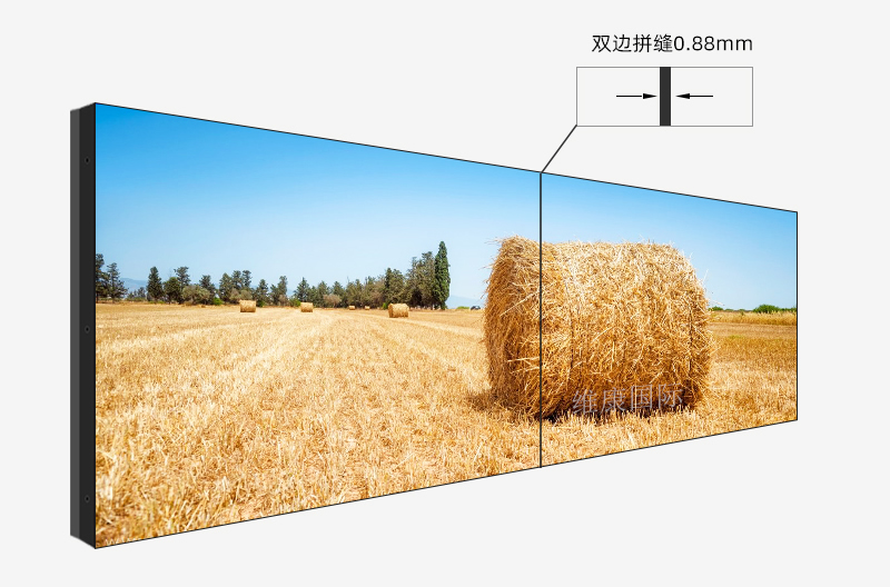 46寸拼接屏0.88mm长宽尺寸为1020*574mm,两屏拼接后的物理边框的宽度是0.88mm,实际显示效果就只有一条细微的边框,对视觉的影响已经下降到最低。