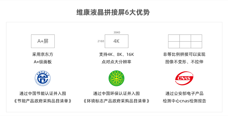 46寸拼接屏0.88mm产品经过了CQC中国质量认证中心检测,取得了环保、节能认证,CNAS检测报告等认证,产品质量稳定可靠。