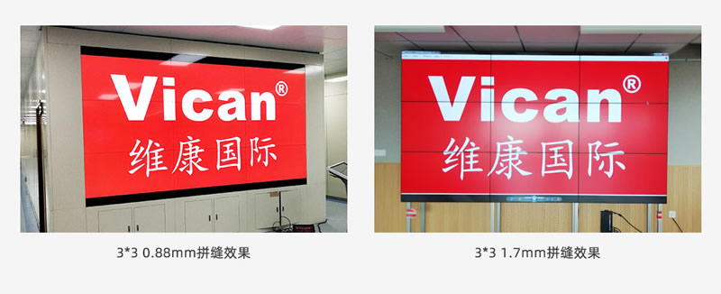 下图是一组3*3的46寸拼接屏0.88mm与1.7mm液晶拼接屏的对比效果,二者大的区别就是拼缝上面,0.88mm的拼缝明显更小,视觉效果更好。