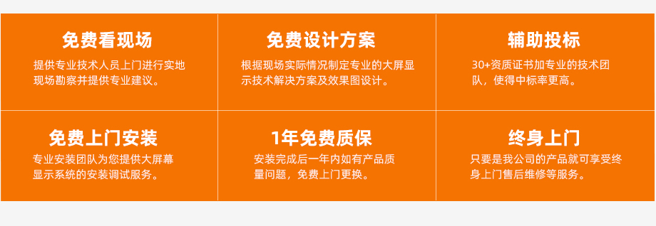 公司提供全面的技术方案设计服务,同时提供专业技术上门安装与调试,特别是一些大型的弧形屏显示领域,对于LED软模组的拼接有很高的技术要求,另外公司还提供长期质保以及上门售后服务。